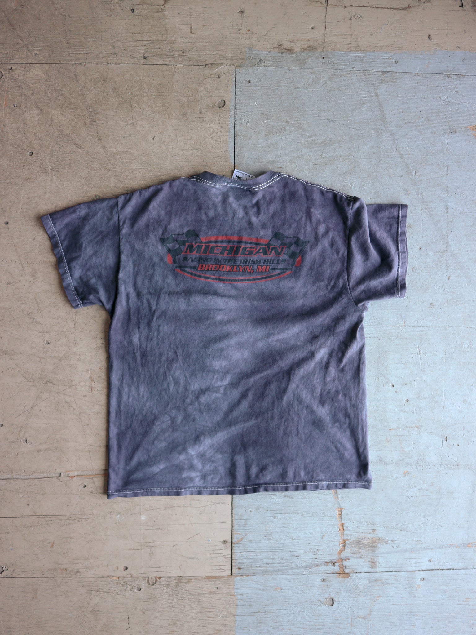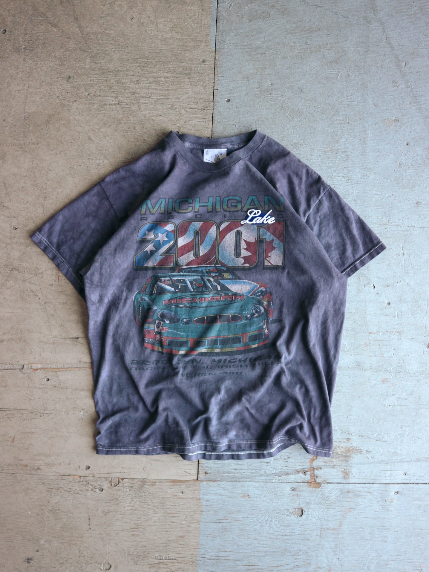 A vintage 2001 t-shirt, featuring a dirty overdye finish, embroidered details, and an original screen print. This piece fits true to size.