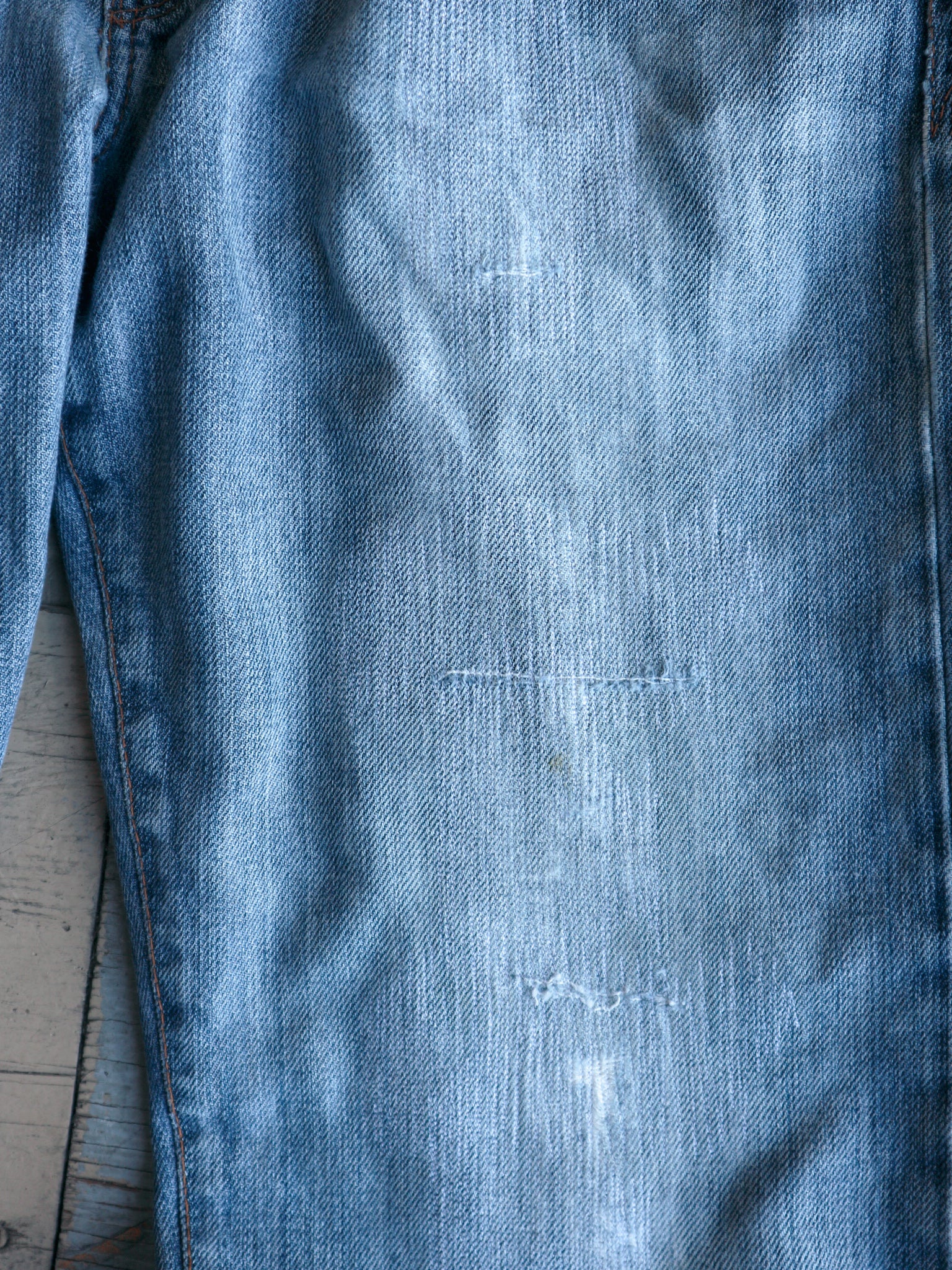 Thrashed vintage Guess Denim, reworked with darned repairs and embroidery. These jeans are bootcut, fitting snug around the waist and gradually getting wider towards the ankle.