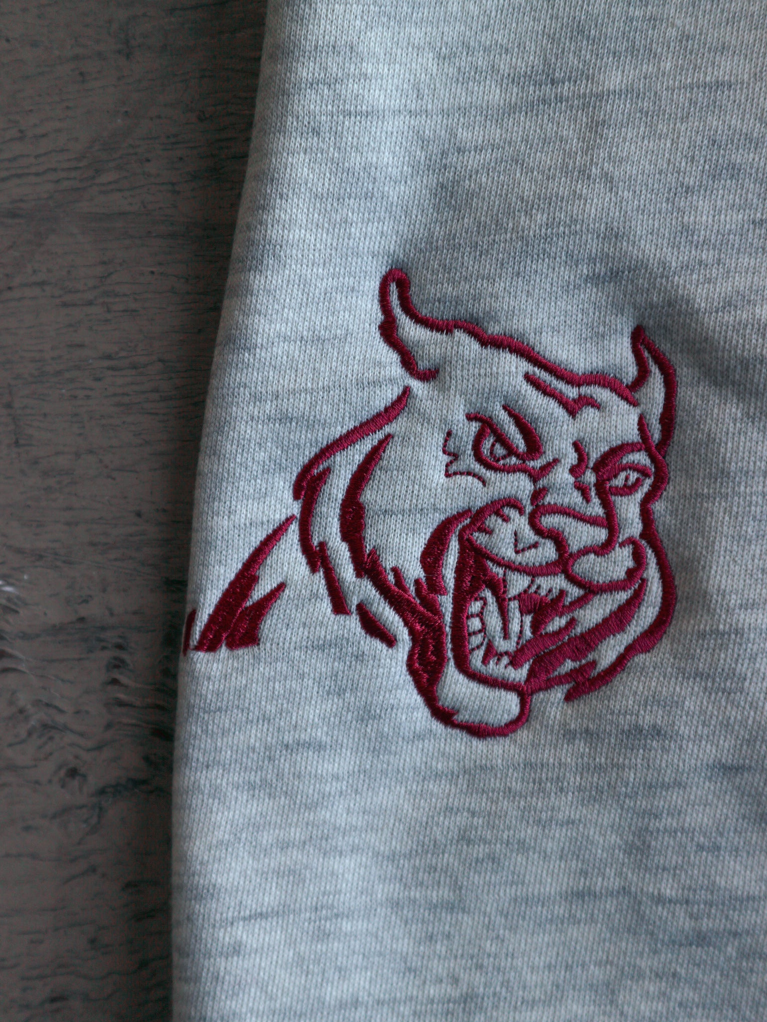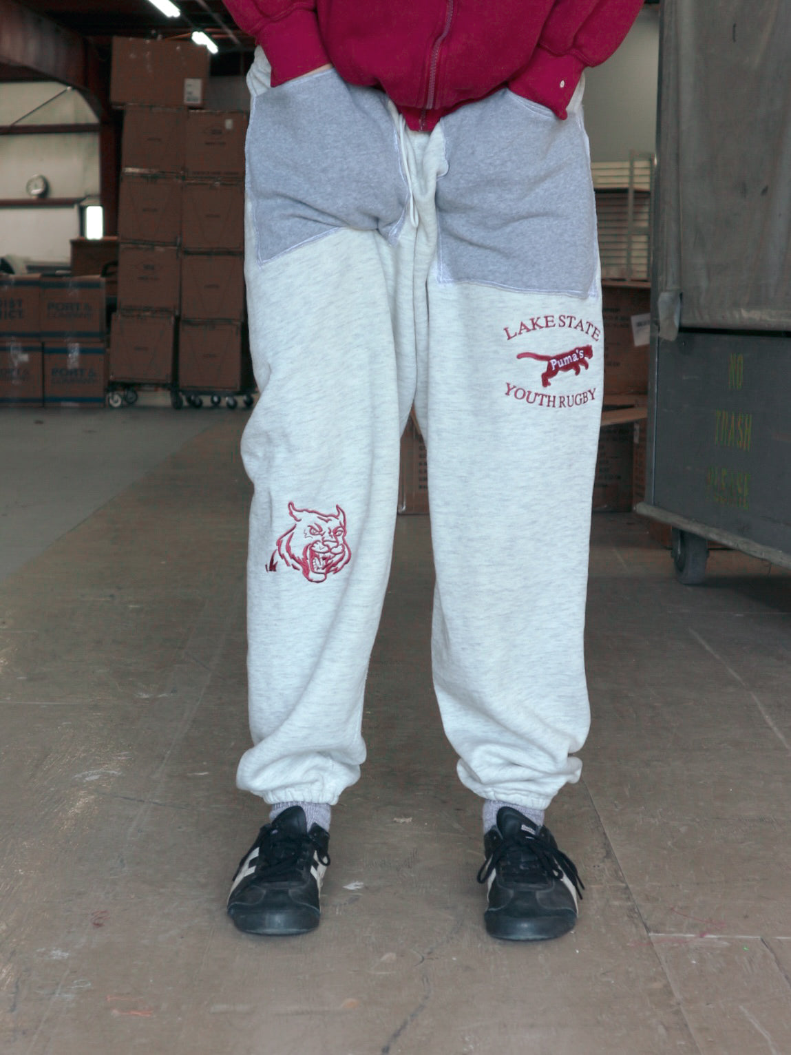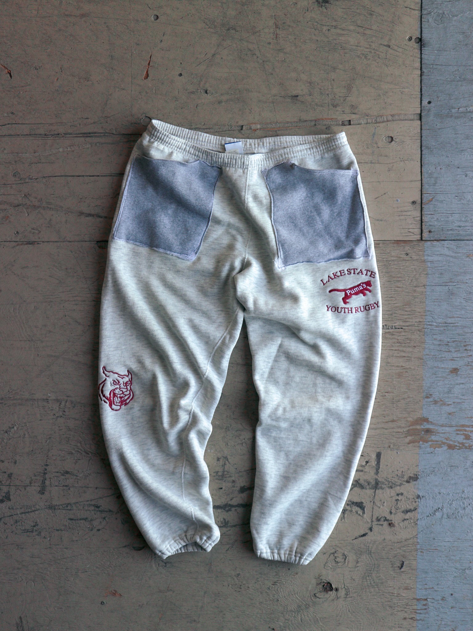 Vintage '90s oatmeal heavyweight jogger, reworked with oversized pockets and multiple embroidered locations. These sweatpants are baggy with tight cuffs, offering a relaxed silhouette.